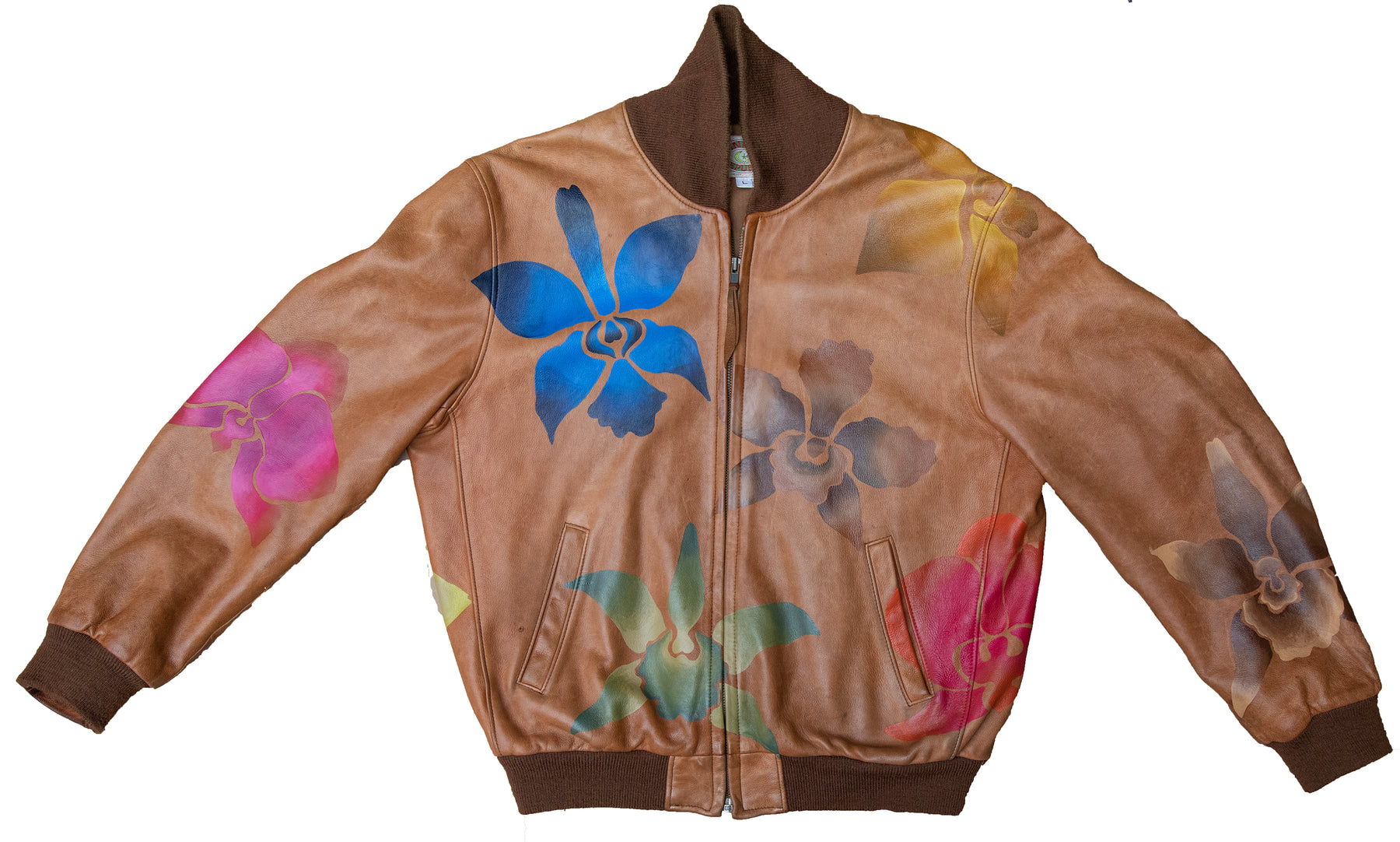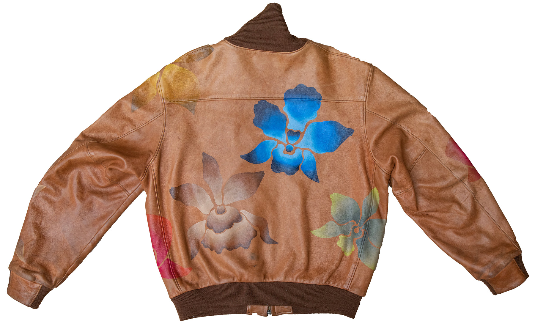 The Orchid Leather Bomber is a vintage leather bomber jacket that Andie has painted with her signature orchid design. The leather on this piece is buttery soft and and perfectly worn in, but in great condition. Wear it oversized or true to size; there is no wrong way to style this jacket!