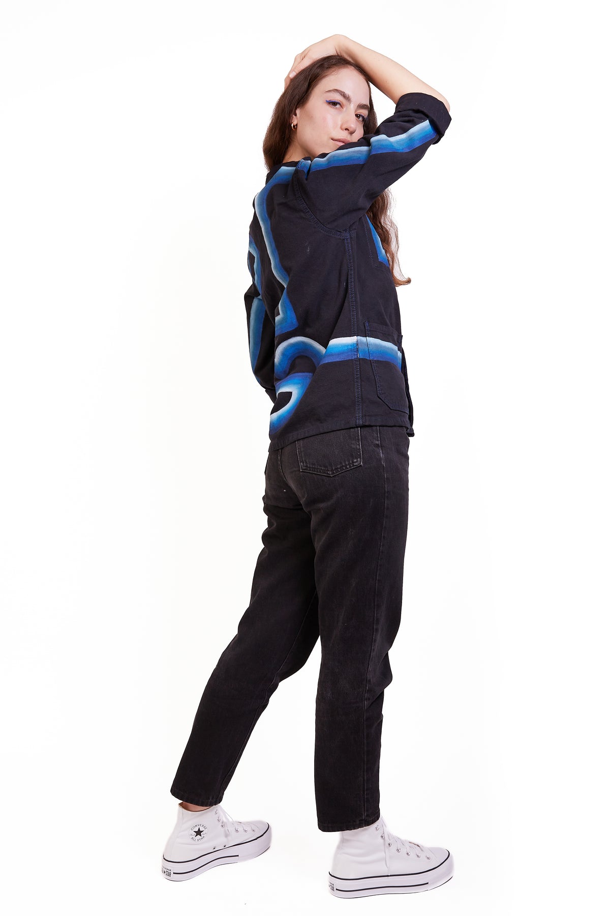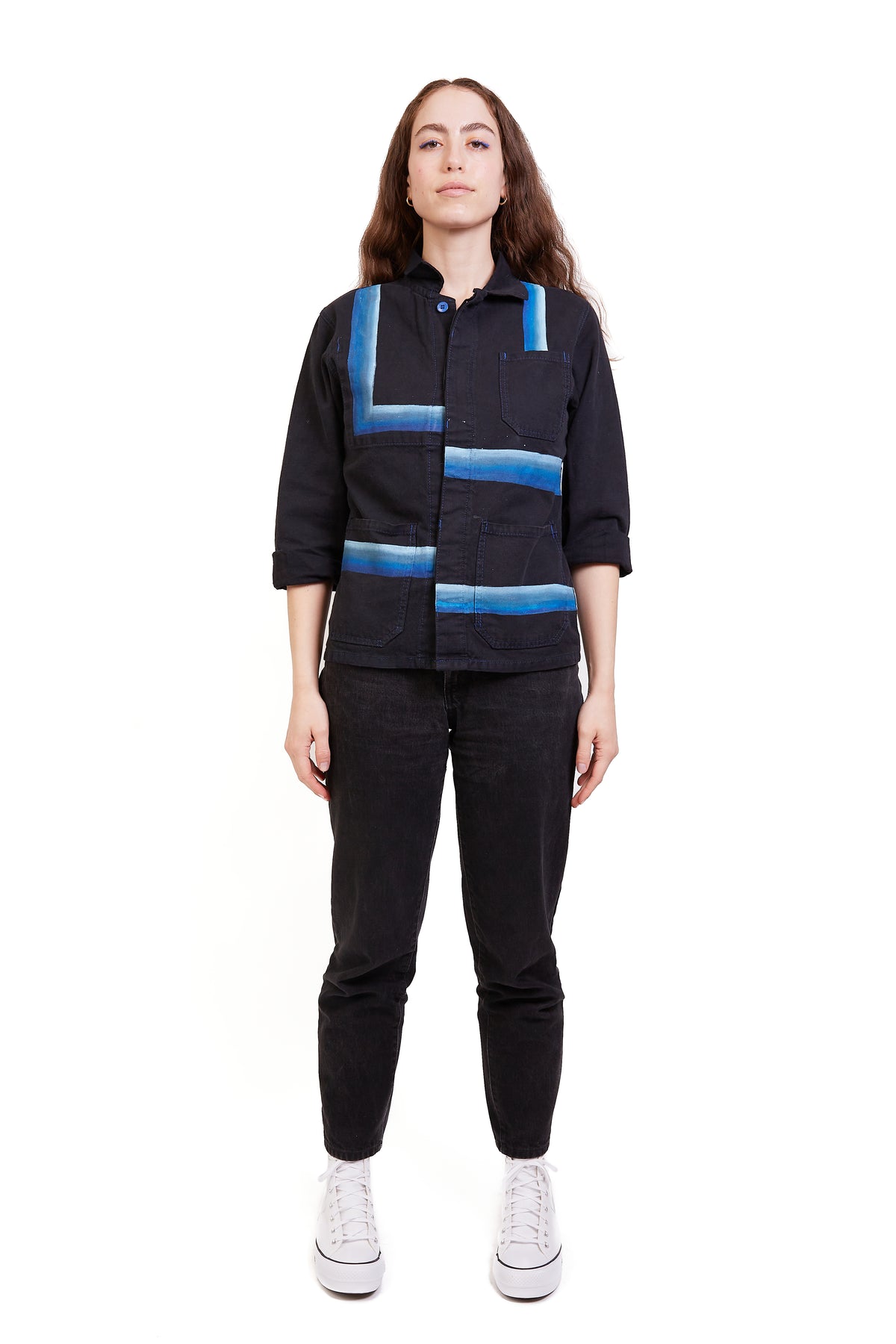 This Black And Blue Chore Jacket is a vintage French workwear piece from the late 1800s/ early 1900s. This jacket features a hidden button down front, front patch pockets, and royal blue stitching. Andie painted a blue ombre line face design on the back that wraps around to the front to create an edgy, utilitarian design.